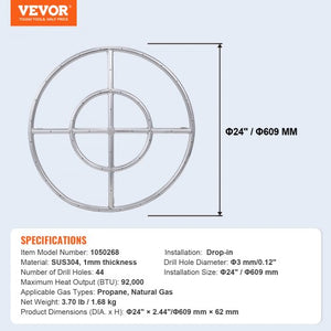 24 inch Round Drop-in Fire Pit Pan, Stainless Steel Fire Pit Burner, Natural & Propane Gas Fire Pan 92,000 BTU, for Indoor or Outdoor Use