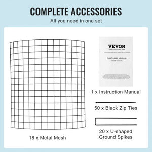 The chicken wire plant protector set includes 18 metal meshes, 50 black zip ties, 20 U-shaped ground stakes, and a manual. Each component is finely forged for hardness and corrosion resistance, ensuring long-term durability.