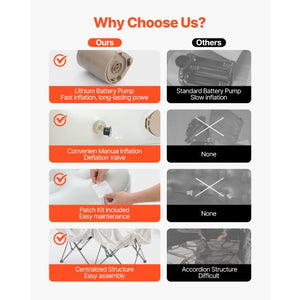 Our inflatable camping bed is easy to set up. Equipped with a long-lasting air pump, it inflates in just 2 minutes. The mattress provides a comfortable resting place, and the PVC & spring polyester fabric enhances durability. After use, it folds compactly for easy storage and portability.