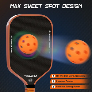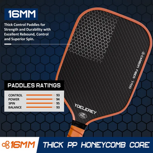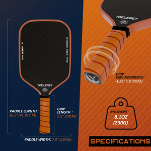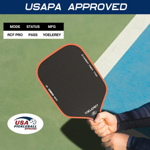 ·【3K CARBON ABRASION SURFACE (CAS)】- Experience unmatched spin control and durability with our 3K Carbon Abrasion Surface (CAS). This advanced material provides 35% extra spin friction, enhancing the friction coefficient between the paddle and ball for superior spin control and longer dwell time!·【T700 RAW CARBON FIBER SURFACE (CFS)】- Elevate your game with the T700 textured surface that enhances ball grip and minimizes vibration. The YOELEREY carbon pickleball paddle offers exceptional rigidity and strength, ensuring stability and rebound even during high-intensity hits!·【16MM POLYPROPYLENE HONEYCOMB CORE】- Dominate the court with our 16mm honeycomb core paddle, featuring a large sweet spot for maximum power and control. The YOELEREY paddle provides a quiet, controllable game, perfect for players seeking power and precision!·【ULTRA COMFORT GRIP】- Play longer and more comfortably with our sweat-absorbing, impact-resistant, and ventilation grip. The 5.5" length and 4.25" circumference ensure a firm hold, minimizing fatigue and enhancing your performance in extended matches!·【USAPA APPROVED】- Compete confidently using the YOELEREY RCF PRO pickleball rackets, officially approved by the USAPA for tournament and international play. Manufactured to meet strict USAPA standards, guaranteeing top-tier performance. Check the USA Pickleball website for more details