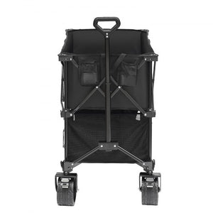 The camping wagon is big and can hold much stuff, including gear, groceries, and even children, which makes it perfect for carrying more stuff. It has two levels of storage. The wagon includes two layers for efficient packing. This wagon has two parts: a top and a bottom. The top part is big and can hold lots of things. The bottom part is also for stuff. This flexibility makes these all-terrain wheels useful for your needs.