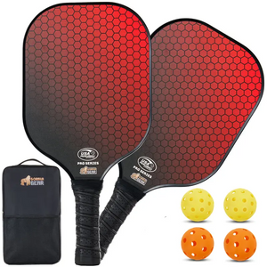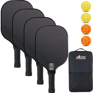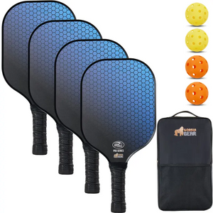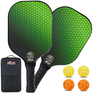 POWER MEETS PRECISION, 7 PIECE SET: Increase your competitive edge with the Gorilla Gear Pickleball Set; perfect for players at all experience levels, even great for beginners; works for right or left handed players.PRO SERIES, USA PICKLEBALL APPROVED: Paddle is approved by USA Pickleball to meet tournament standards; paddle's fiberglass face is lightweight to help reduce reaction time and makes it easier to switch between forehand and backhand; reinforced edges to improve strength and long lasting use; polypropylene honeycomb core for extra stabilitySHOCK ABSORBENT FOR LOW IMPACT: Regulation paddle provides a smooth balanced and controlled playing experience; PU coated handle helps absorb shock; oversized sweet spot for more consistent and optimal hitsCOMFORTABLE ERGONOMIC GRIP HANDLE: Sweat wicking ventilation holes on the paddles handle help minimize slippage and provide players with a strong and comfortable grip for enhanced controlEASY CARRY BAG WITH OUTER MESH POCKETS: Carrying case features an outer mesh pocket for balls and a convenient shoulder strap; paddle measures 15.7 inches by 7.9 inches and weighs 8 ounces
