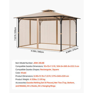 - Compatible Gazebo Dimensions: 10×12×7.3 ft / 304.8×365.8×222.5 cm