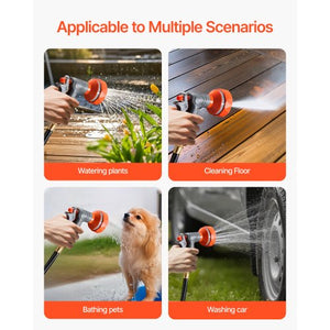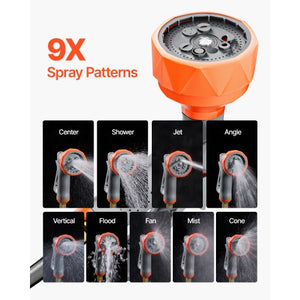 This retractable hose reel features durable, leak-proof metal connectors, a slow rewind system, and 9 spray settings. Its sun and freeze-resistant design suits all weather, with an adjustable lock and handle for easy storage and mobility. The higher water flow boosts efficiency.