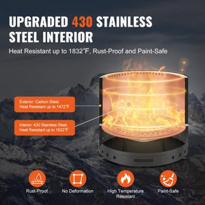 The fire pit’s 430 stainless steel inner liner is highly durable and resistant to high heat. It can withstand temperatures up to 1832°F without rust or paint peeling. It ensures long-lasting performance even during prolonged high-temperature use. The carbon steel outer wall adds extra durability. The strong carbon resistance provides more strength, making it tough and resistant to corrosion and deformation. So, this firepit is ideal for use in harsh winter conditions or during extended outdoor gatherings.